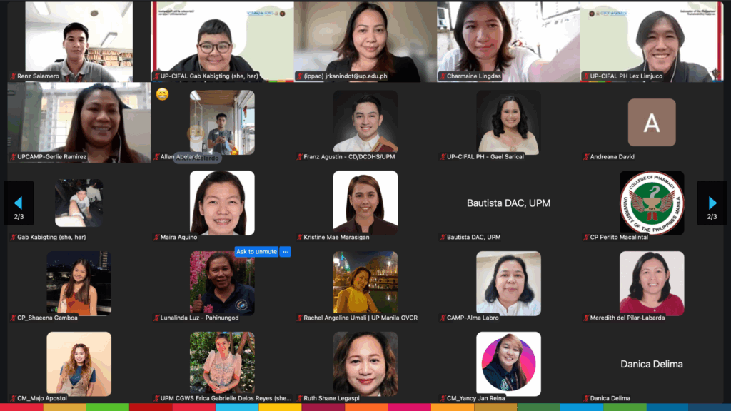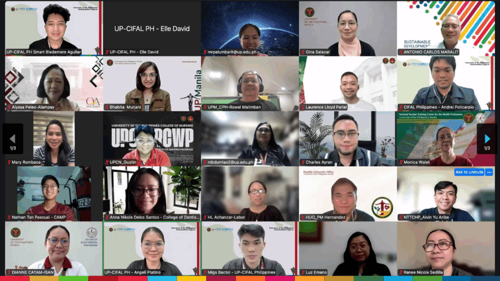 5 September 2025—UP-CIFAL Philippines conducted the first leg of the UP Sustainability Caravan in partnership with UP Manila, held via Zoom. With the theme “Transforming the Future through Synergetic Sustainability”, the online event gathered around 60 participants from across the UP system for a day of lectures, workshops, and discussions aimed at deepening understanding and advancing the implementation of the United Nations Sustainable Development Goals (SDGs) within the academic community of the UP System.